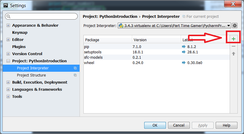 To install the sfc_models package, go to the File->Settings menu option, and then go to the "Project Interpreter" option. You press the "+" button (highlighted above) to choose and install the package. (It is already installed on my machine, and shows up in the list of packages.